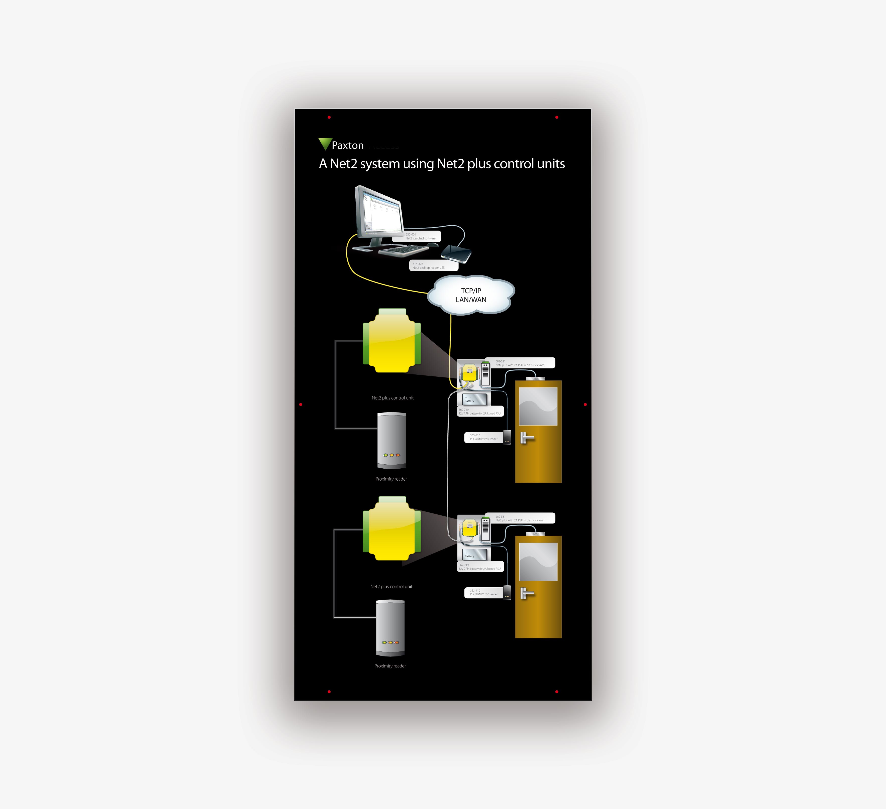 About – The Net2 demo board has been designed for use in showrooms and training rooms. The combination of the graphics and working equipment clearly demonstrates the structure of a Net2 system. They are a great way of presenting Net2 and will prove useful for training and for demonstrating Net2 to potential customers.