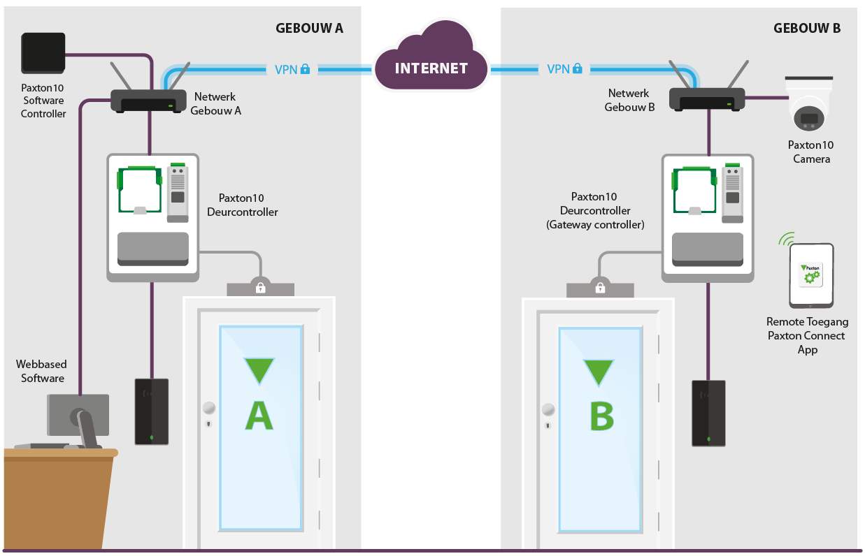Bij Multi-site is de Paxton10 Software Controller op een ander netwerk geïnstalleerd dan uw Paxton10 deurcontrollers of camera’s. Wanneer beide apparaten verbinding hebben met het internet is het mogelijk om de Paxton10 deurcontroller via onze cloud gateway toe te voegen aan de Paxton10 Software Controller. Hierdoor is het niet meer nodig om een VPN of port forwarding verbinding in te stellen tussen beide locaties. De controllers worden namelijk via het internet toegevoegd.