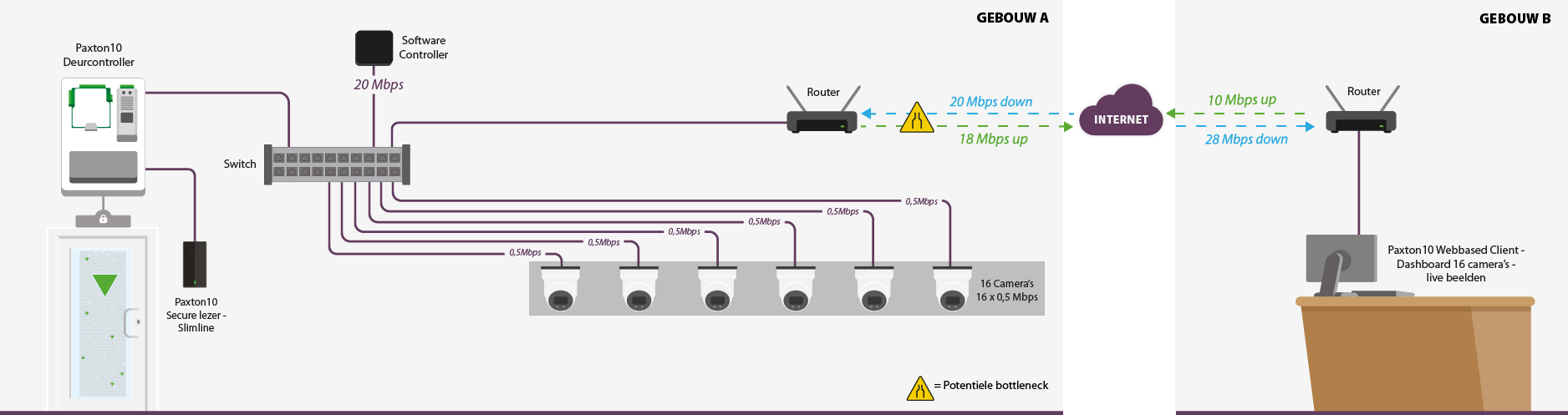 In de onderstaande situatie zijn 16 camera’s geïnstalleerd op het netwerk. Via de Paxton Remote toegang wordt er vanuit een externe locatie een dashboard geopend met alle 16 de camera beelden. In het dashboard word de sub stream gebruikt welke 0.5Mpbs aan bandbreedte nodig heeft. Er is dus 16*0.5Mbps = 8 Mbps aan downloadsnelheid nodig om de camera beelden te downloaden. Om de remote toegang te gebruiken is er 20Mpbs download- en 10Mbps uploadsnelheid benodigd.